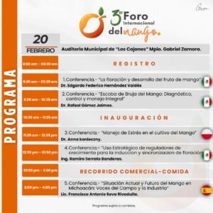 LOS CAJONES (Gabriel Zamora), Michoacán, 9 de febrero de 2026.- Con la finalidad de brindar un impulso a la excelencia del mango mexicano, mediante capacitaciones agrícolas e innovación, habrá de llevarse a cabo la tercera edición del Foro Internacional del Mago, en esta población, los días 20 y 21 del presente mes de febrero.