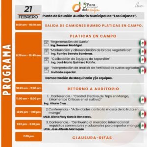 Por la tarde, las conferencias, “control efectivo de trips en mango” y “certificación, como herramienta para agregar valor y abrir el mercado internacional”. Posteriormente la clausura y rifas de accesorios e insumos.