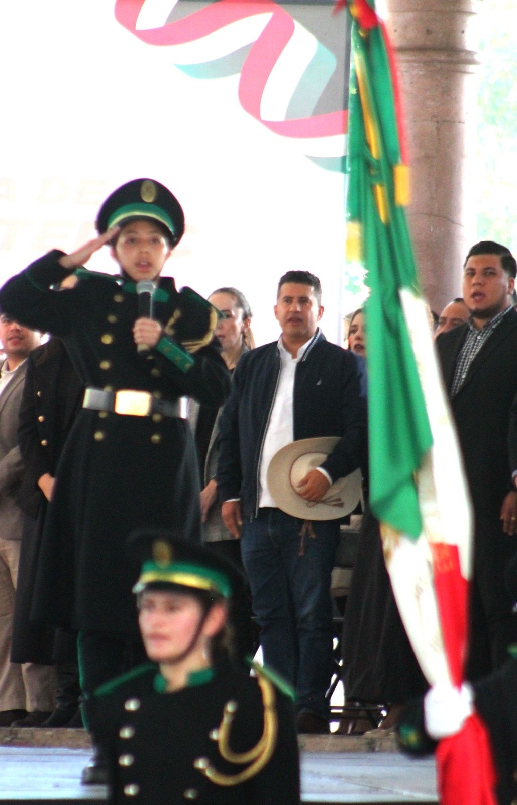 Honores a los símbolos patrios; juramento a la bandera cargo del alumno Ángel Omar Mora Urbano y el mensaje, también por parte de dos alumnos del Centro de Educación y Capacitación Forestal número 1.