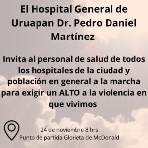 Nos dirigimos a ustedes, la comunidad médica, de enfermería, trabajo social, psicología, radiología y nutrición del sector salud público de la ciudad de Uruapan, Michoacán, para expresar nuestra profunda preocupación y exigir de manera urgente y contundente, que se tomen medidas efectivas para resolver la creciente situación de inseguridad que estamos viviendo en el municipio bajo su gobierno.