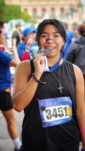 *Morelia, Michoacán, 7 de septiembre de 2025.-* La alumna Sofía Roque Cortés, del plantel Purépero del Colegio de Estudios Científicos y Tecnológicos del Estado de Michoacán (Cecytem) ganó medalla de oro en la 15ª Carrera Atlética de la Fundación Cinépolis, en la categoría juvenil 15-19 años, en la prueba de 10km.