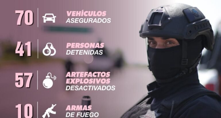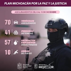 *Morelia, Michoacán, 18 de diciembre de 2025.-* En un periodo de ocho días, en el estado se aseguraron 41 personas por presuntos actos ilícitos, 57 artefactos explosivos, 70 vehículos, 10 armas de fuego y casi mil cartuchos útiles, derivado de las acciones del Plan Paricutín en Michoacán.