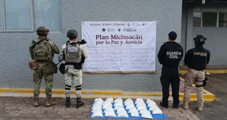 *Morelia, Michoacán, 15 de abril de 2026.-* Resultado de una acción conjunta coordinada entre elementos de las secretarías de Seguridad Pública (SSP), de la Defensa Nacional (Defensa), Guardia Nacional (GN) y Fiscalía General del Estado (FGE) fueron asegurados un aproximadamente 40 kilogramos de una sustancia blanca y granulada con las características propias de la metanfetamina.