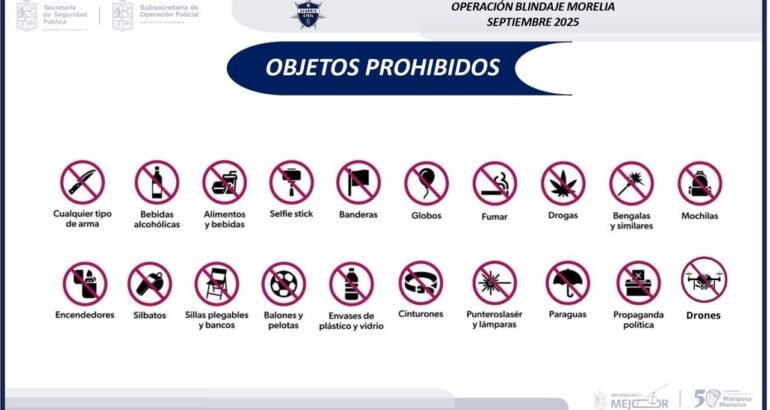*Morelia, Michoacán, 13 de septiembre de 2025.-* Para garantizar el orden y la seguridad en las fiestas patrias, la Secretaría de Seguridad Pública (SSP) da a conocer la lista de objetos cuyo ingreso no estará permitido al primer cuadro del Centro de Morelia.