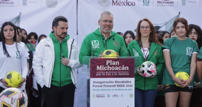 *Morelia, Michoacán, 26 de febrero de 2026.-* En Michoacán se dio la patada inaugural del Mundialito Futsal Femenil IMSS, que forma parte del Mundial Social México 2026, una iniciativa de la presidenta Claudia Sheinbaum Pardo, para llevar este deporte de los estadios a los espacios públicos, destacó el gobernador Alfredo Ramírez Bedolla.
