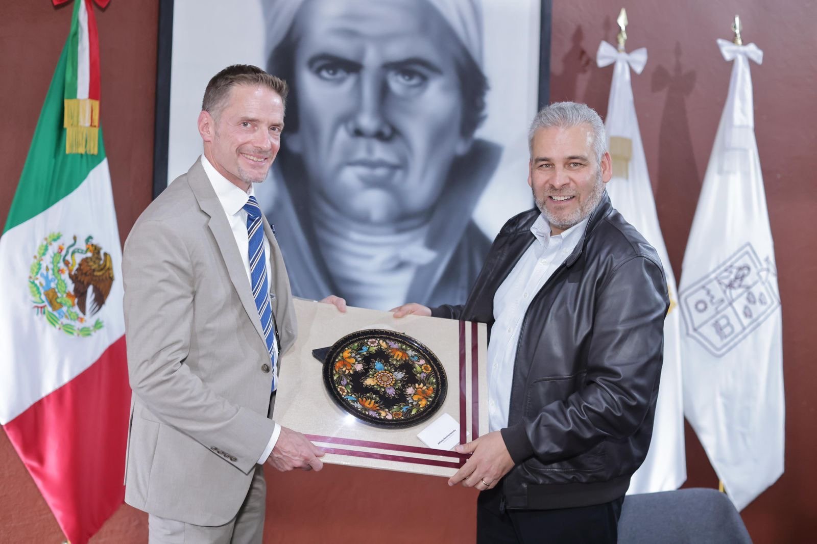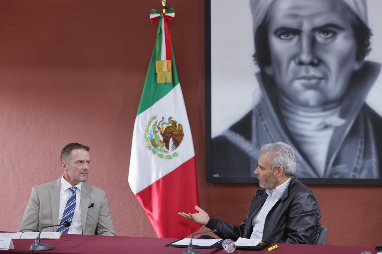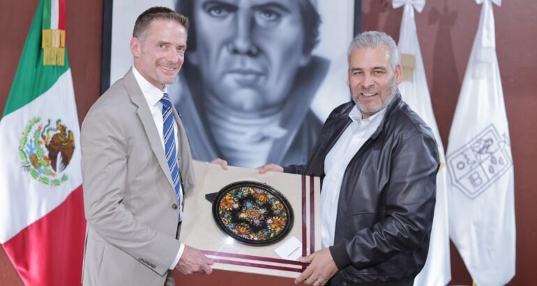 *Morelia, Michoacán, 20 de agosto de 2024.-* El gobernador Alfredo Ramírez Bedolla y el agregado de Seguridad Diplomática de la Embajada de Estados Unidos en México, William Densmore, estrecharon lazos de cooperación para reforzar acciones de seguridad y certificación ambiental del cultivo del aguacate para mantener su exportación.