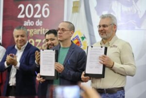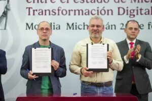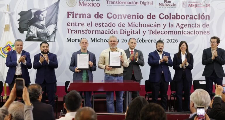*Morelia, Michoacán, 26 de febrero de 2026.–* A fin de agilizar y simplificar los trámites que realiza la población ante el Gobierno de Michoacán y el Gobierno Federal, el gobernador Alfredo Ramírez Bedolla firmó un convenio de colaboración con José Antonio Peña Merino, titular de la Agencia de Transformación Digital y Telecomunicaciones.