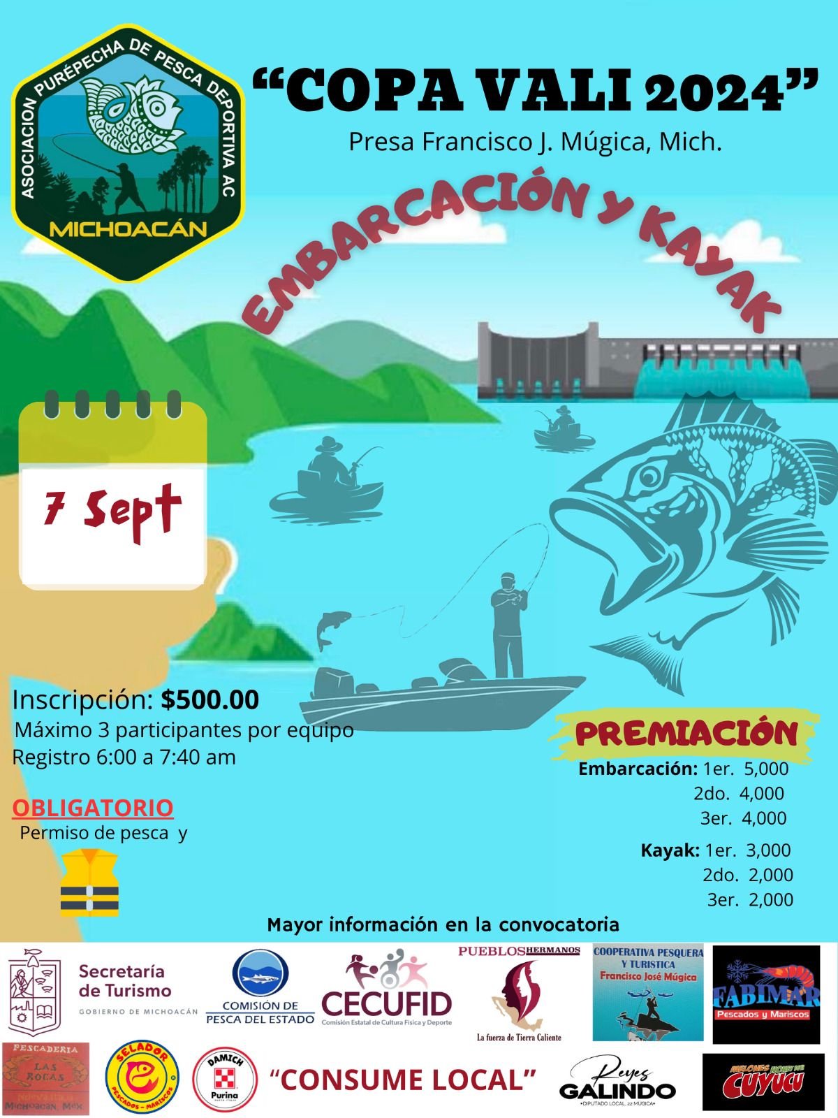 *Morelia, Michoacán, 16 de agosto de 2024.-* La Comisión de Pesca del Estado de Michoacán (Compesca), encabezada por Ramón Hernández Orozco, invita el próximo 7 de septiembre al torneo de pesca deportiva tercera Copa Vali en la presa Francisco J. Múgica, en la Tierra Caliente de Michoacán.