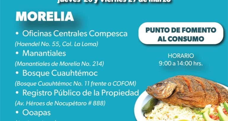 *Morelia, Michoacán, 25 de marzo de 2026.-* La Comisión de Pesca de Michoacán (Compesca) informa que este jueves 26 y viernes 27 de marzo serán los últimos días de operación de los puntos de fomento al consumo de pescados y mariscos con motivo de la temporada de Cuaresma en la capital michoacana.