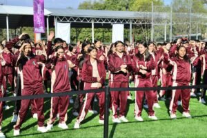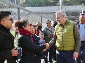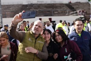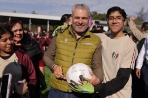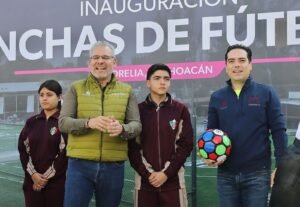 *Morelia, Michoacán, 10 de diciembre de 2025.-* Para impactar de manera positiva en el desarrollo físico, social, emocional y académico de las y los estudiantes, el gobernador Alfredo Ramírez Bedolla dio la patada inaugural de dos canchas de fútbol 7 en la Escuela Secundaria Federal No. 2 “Hermanos Flores Magón”.