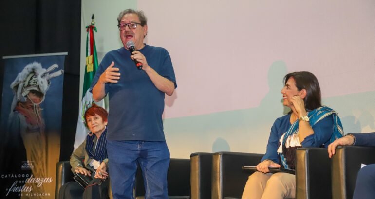 El director del Fondo de Cultura Económica (FCE), Paco Ignacio Taibo II, reconoció el compromiso de la secretaria de Educación, Gaby Molina, con el fomento a la lectura, en la presentación del «Catálogo de Danzas y Fiestas de Michoacán», junto al gobernador Alfredo Ramírez Bedolla y el ingeniero Cuauhtémoc Cárdenas.