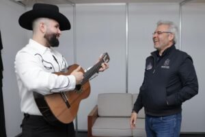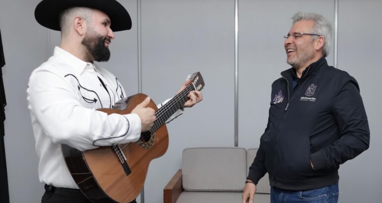*Morelia, Michoacán, 16 de agosto de 2025.-* Previo al inicio del concierto de Carín León en el Festival Jalo x las Mujeres, el gobernador Alfredo Ramírez Bedolla regaló una guitarra artesanal elaborada en Paracho.