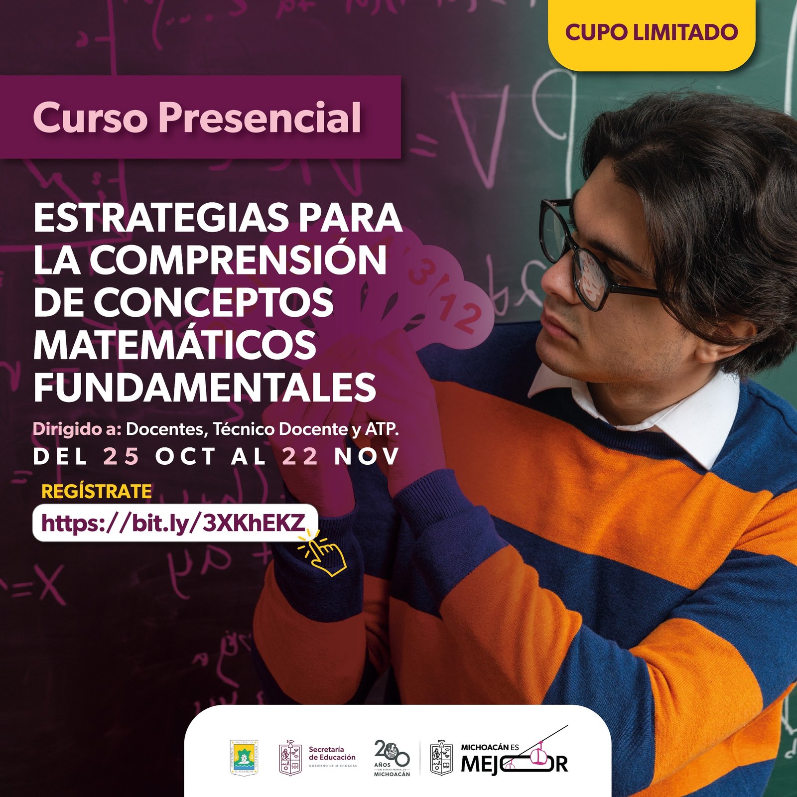 Entre los talleres se encuentra el de Estrategias para la comprensión de conceptos matemáticos fundamentales, que se llevará a cabo de forma presencial en cuatro sedes; inicia el 25 de octubre y serán cuatro sesiones de cinco horas. Los interesados pueden inscribirse en la liga https://bit.ly/3XKhEKZ.