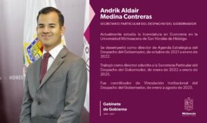 *Morelia, Michoacán, 14 de agosto de 2025.-* El gobernador Alfredo Ramírez Bedolla designó a Andrik Aldair Medina Contreras como secretario particular del Despacho del Gobernador, en sustitución de Raúl Zepeda Villaseñor.