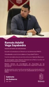 El nuevo subsecretario, quien arriba en el fortalecimiento del Plan Michoacán por la Paz y la Justicia, es licenciado en Derecho por el INACE y cuenta con una trayectoria sólida en materia de operación, inteligencia y disciplina policial, tanto en el ámbito militar como civil. Su experiencia incluye siete años de servicio activo en el Ejército Mexicano.