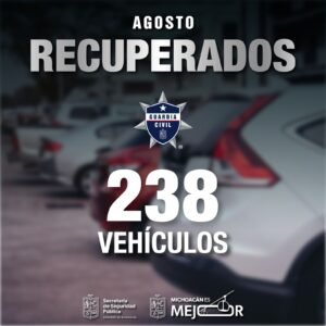 *Morelia, Michoacán, 7 de septiembre del 2025.-* Un total de 238 vehículos fueron recuperados durante el mes de agosto, a través de los sistemas operativos y el reforzamiento a las acciones de vigilancia de los elementos de la Secretaría de Seguridad Pública (SSP), informó su titular Juan Carlos Oseguera Cortés.