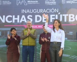 *Morelia, Michoacán, 10 de diciembre de 2025.-* La educación y el deporte son pilares para la construcción de una cultura de la paz, para la creación de una vida y entornos saludables, destacó la secretaria de Educación, Gabriela Molina, al acompañar al gobernador Alfredo Ramírez Bedolla durante la inauguración de las canchas de futbol 7 en la Escuela Secundaria Federal número 2 «Hermanos Flores Magón». La obra conto con una inversión de 10 millones de pesos.