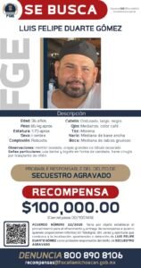 *Morelia, Michoacán, a 8 de diciembre de 2025.–* Como resultado de los trabajos de investigación que lleva a cabo la Fiscalía General del Estado de Michoacán (FGE), se logró establecer la presunta responsabilidad de Luis Felipe Duarte Gómez, en el delito de secuestro agravado, cometido el pasado 24 de noviembre, en la ciudad de Uruapan, por lo que se ha emitido acuerdo de ofrecimiento de recompensa para quien proporcione información veraz y útil que conduzca a su detención.