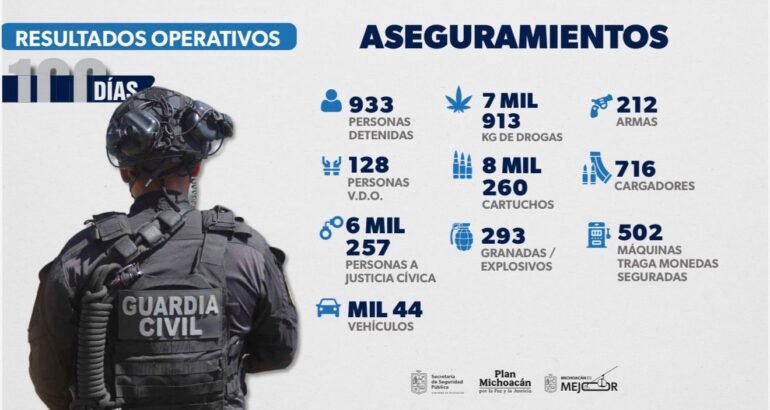 *Morelia, Michoacán, 6 de marzo de 2026.-* A 100 días de asumir la titularidad de la Secretaría de Seguridad Pública (SSP), José Antonio Cruz Medina presentó los principales resultados operativos mediante la estrategia del Plan Michoacán por la Paz y la Justicia, donde destacó la detención de 933 personas, el aseguramiento de 7 mil 913 kilogramos de droga, 212 armas de fuego y mil 044 vehículos con reporte de robo o relacionados en actividades ilícitas, efectuados en diversas regiones del estado.