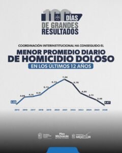 El secretario José Antonio Cruz Medina destacó que estos resultados forman parte de una estrategia basada en inteligencia, investigación y despliegue operativo, la cual ha permitido mantener la tendencia a la baja en los homicidios dolosos en Michoacán, registrando actualmente el promedio diario más bajo de víctimas en los últimos 12 años, con 2.47 casos por día, de acuerdo con las estadísticas presentadas.
