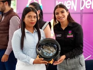 INFOMANIA/ URUAPAN, MICH./ MAR-12-AGO-2025/ La secretaria de Bienestar y Política Social, Rosa Alejandra Vargas Rauda, junto con Vanessa Arely Villanueva Arreola, directora del Instituto Municipal de la Juventud, entregaron el primer lugar del concurso Joven del Progreso 2025.