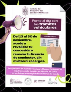 *Morelia, Michoacán, 12 de noviembre de 2025.-* Con el propósito de mantener un padrón actualizado, ordenado y con documentación vigente, el Instituto del Transporte del Estado de Michoacán (ITransporte), en coordinación con la Secretaría de Finanzas y Administración, anunció la condonación de multas y recargos para conductores de transporte público que realicen la revalidación de sus concesiones o renovación de licencias entre el 13 y el 30 de noviembre.