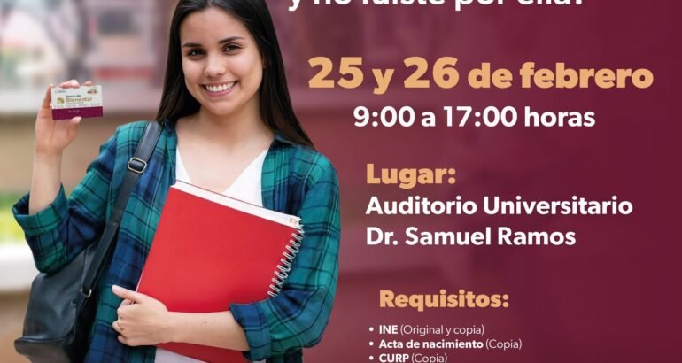 Para realizar el trámite es necesario que se presenten en el Auditorio Universitario “Dr. Samuel Ramos” con original y copia de la identificación oficial, acta de nacimiento, CURP y comprobante de domicilio. La atención se brindará de 9:00 a 17:00 horas.