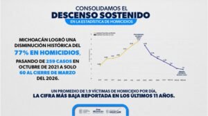 *“Evitamos 200 homicidios al mes”: destacó el gobernador Alfredo Ramírez Bedolla, al enfatizar que esta cifra representa una disminución del 77 % del delito en comparación con el inicio de la administración en 2021, al pasar de 259 homicidios dolosos mensuales en 2021 a 60 al cierre de marzo de 2026.*
