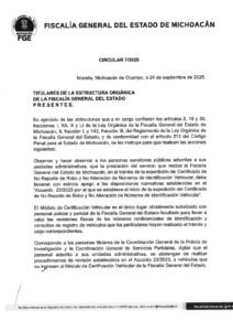 *Morelia, Michoacán, 29 de septiembre de 2025.-* El Fiscal General del estado de Michoacán, Carlos Torres Piña, emitió la circular 7/2025, con la cual se prohíben las revisiones de los números de identificación de vehículos fuera de instalaciones oficiales.