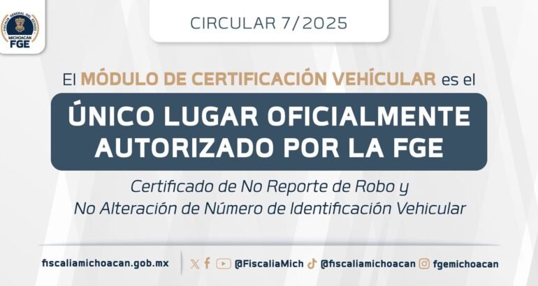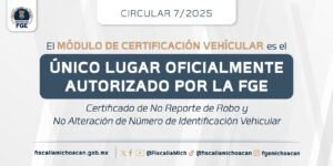 De acuerdo con el documento, las inspecciones deberán realizarse únicamente en el Módulo de Certificación Vehicular de la Fiscalía General del Estado (FGE), el cual es el único espacio autorizado para llevar a cabo la revisión física de los números confidenciales de identificación y las consultas de registro, siempre y cuando los particulares hayan realizado el trámite y el pago correspondientes.