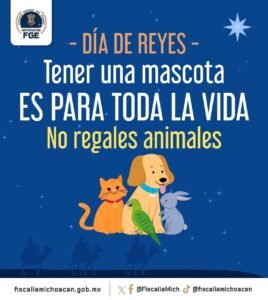 *Morelia, Michoacán, a 4 de enero de 2025.-* En el marco de las actividades del Día de Reyes, la Fiscalía General del Estado de Michoacán, a través de la Unidad de Investigación y Persecución del Delito de Maltrato Animal, adscrita a la Fiscalía Especializada en Delitos Contra el Medio Ambiente y la Fauna, participará activamente en operativos especiales en diversos puntos de la capital, encabezados por el Ayuntamiento de Morelia.