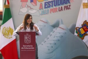 *Uruapan, Michoacán, 2 de octubre de 2025.-* La secretaria de Educación, Gabriela Molina, y la presidenta del DIF de Uruapan, Grecia Quiroz, iniciaron la entrega de calzado deportivo a estudiantes de secundaria en el municipio, como parte del programa Jalo a Estudiar, Jalo por la Paz, que tiene entre sus objetivos ayudar a la economía familiar de 14 mil alumnos de 53 planteles.