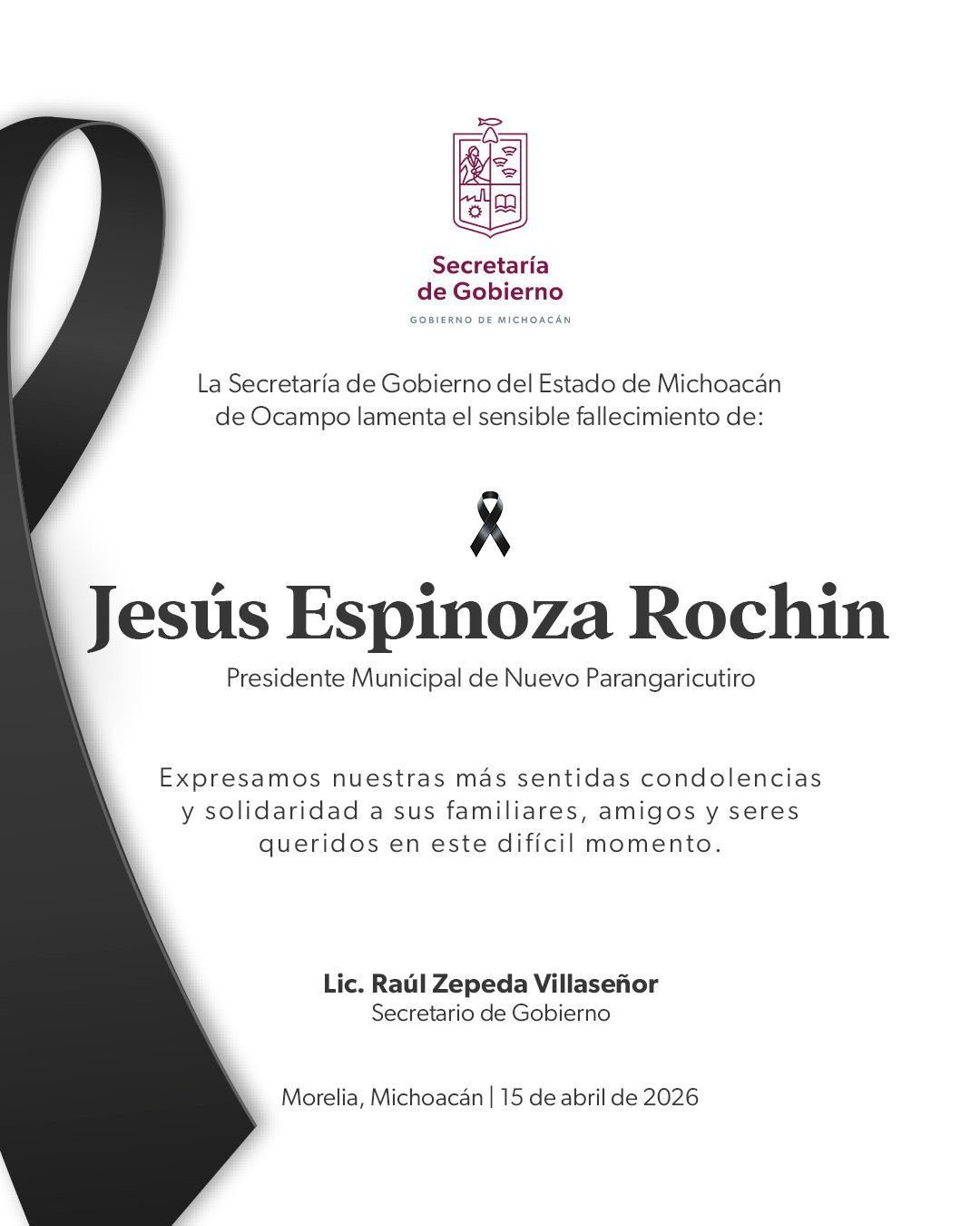 Morelia, Michoacán, 15 de abril de 2026.- El secretario de Gobierno, Raúl Zepeda Villaseñor, lamentó el fallecimiento del presidente municipal de Nuevo Parangaricutiro, quien perdió la vida en un hospital mientras recibía atención médica derivada de una cirugía practicada por un padecimiento de salud.