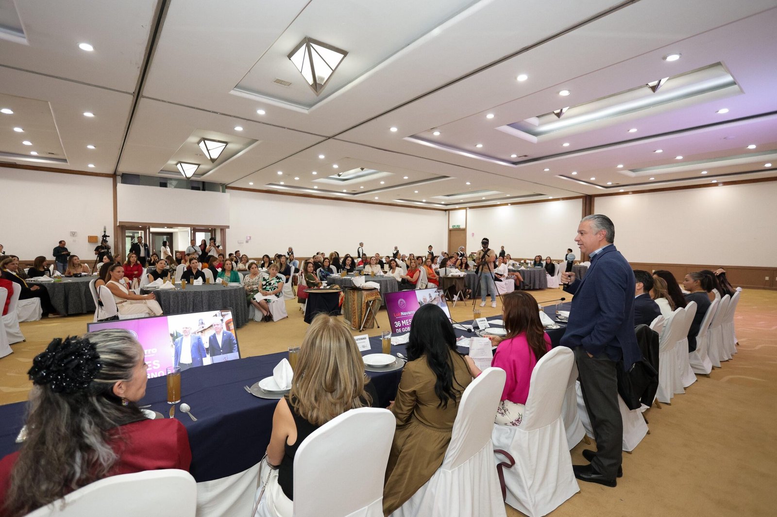 Acompañado de los titulares de las secretarías de Obras Públicas y de Desarrollo Urbano y Movilidad, Rogelio Zarazúa Sánchez y Gladyz Butanda Macías, respectivamente, el tesorero invitó a las empresarias michoacanas a participar con proyectos e inversiones productivas para dinamizar el desarrollo integral y sostenido de Michoacán.
