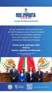 En el marco del Primer Informe de Actividades Legislativas del GPPAN, Quintana Martínez, reiteró que las y los diputados de Acción Nacional refrendan su compromiso para reformar y crear leyes que permitan atender, de forma integral, las necesidades más sentidas de las y los michoacanos.