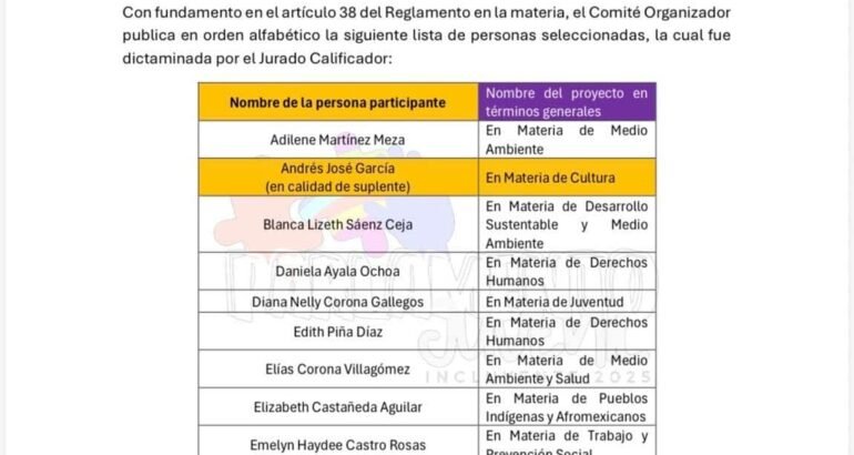 Con fundamento en el artículo 38 del Reglamento en la materia, el Comité Organizador, junto con el Jurado Calificador, reconoció el talento y compromiso de las juventudes que presentaron propuestas en temas como igualdad de género, derechos humanos, salud, educación, medio ambiente, cultura y participación ciudadana.