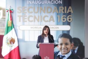 *Morelia, Michoacán, 27 de enero de 2026.-* El gobernador Alfredo Ramírez Bedolla inauguró las nuevas instalaciones de la Escuela Secundaria Técnica 166, obra en la que se invirtieron 12 millones de pesos para la construcción de un edificio con seis aulas, laboratorio, patio cívico, cancha de usos múltiples, entre otras amenidades.