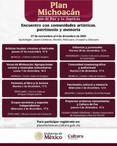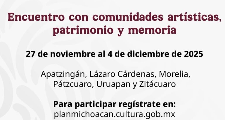 *Morelia, Michoacán, 25 de noviembre del 2025.-* La Secretaría de Cultura de Michoacán (Secum) informa que ya está abierto el registro para el encuentro “Comunidades artísticas, patrimonio y memoria”, que se realizará del 27 de noviembre al 4 de diciembre de 2025, como parte del Plan Michoacán por la Paz y la Justicia.
