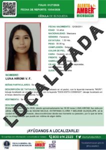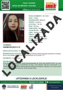 *Zamora, Michoacán, a 14 de abril de 2026.-* La Fiscalía General del Estado de Michoacán (FGE) informa que fueron localizadas sanas y salvas las cuatro menores que habían sido reportadas como desaparecidas en el municipio de Zamora, tras perderse comunicación con ellas desde el pasado 8 de abril, siendo reportada su desaparición ante las autoridades el día 10.