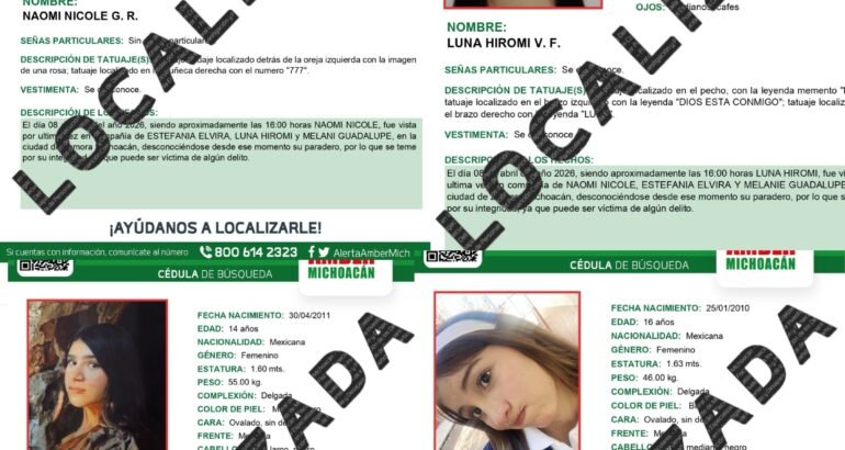 Se trata de Melanie Guadalupe “N”; Naomi Nicole “N”; Luna Hiromi “N” y Estefanía Elvira “N”, quienes fueron ubicadas sobre la carretera Sahuayo-Zamora, mediante acciones implementadas por el personal de la Fiscalía Especializada en Investigación y Persecución de los Delitos de Desaparición Forzada de Personas y Desaparición Cometida por Particulares de la FGE.