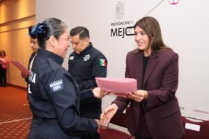 *Morelia, Michoacán, 16 de diciembre de 2025.—* La secretaria de Igualdad Sustantiva y Desarrollo de las Mujeres Michoacanas, Alejandra Anguiano González, en coordinación con el secretario de Seguridad Pública, José Antonio Cruz Medina y la Policía Auxiliar, realizó la clausura del Curso Especializado en Materia de Primer Respondiente con Perspectiva de Género, en donde participaron 2 mil 134 personas servidoras públicas.