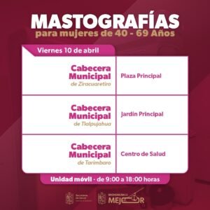 El miércoles 8 de abril, el mastógrafo se integrará a la Feria del Bienestar en el jardín principal de Tlalpujahua. Posteriormente, el jueves 9 y viernes 10, brindará servicio en las instalaciones del Poder Judicial en Morelia y en la plaza principal de Ziracuaretiro. La jornada semanal concluirá este mismo viernes con una unidad móvil en el centro de salud de Tarímbaro.