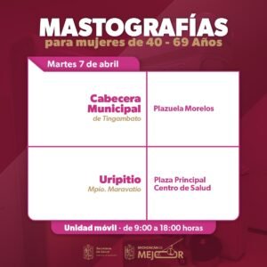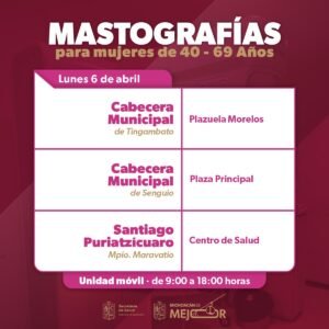 El miércoles 8 de abril, el mastógrafo se integrará a la Feria del Bienestar en el jardín principal de Tlalpujahua. Posteriormente, el jueves 9 y viernes 10, brindará servicio en las instalaciones del Poder Judicial en Morelia y en la plaza principal de Ziracuaretiro. La jornada semanal concluirá este mismo viernes con una unidad móvil en el centro de salud de Tarímbaro.