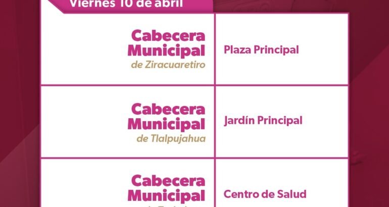 Para el martes 7, la atención llegará a la localidad de José María Morelos en Senguio, en el centro de salud de Uripitío en Maravatío y en la comunidad de Cuanajo, en Pátzcuaro, donde el servicio se extenderá hasta el miércoles 8.