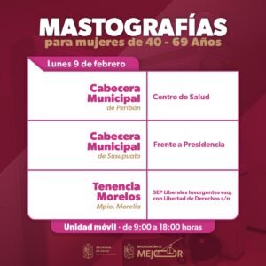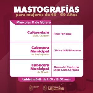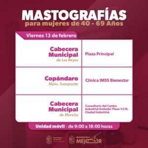 Las jornadas de atención serán gratuitas y estarán disponibles para mujeres de entre 40 y 69 años de edad. Las unidades atenderán en los municipios de Peribán, Susupuato, Morelia, Juárez, Uruapan y Los Reyes, en un horario de 09:00 a 18:00 horas.