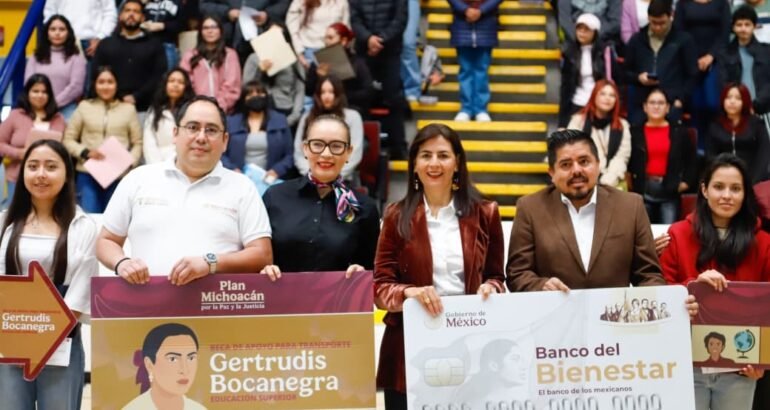 *Morelia, Michoacán, 10 de febrero de 2026.-* Con el apoyo de la presidenta Claudia Sheinbaum Pardo se impulsa la permanencia escolar a través de becas; así Michoacán se consolida como un referente nacional con apoyo para estudiantes de todos los niveles y con la nueva Beca Gertrudis Bocanegra, esquema que brinda mil 900 pesos bimestrales para transporte de universitarios, destacó la secretaria de Educación, Gabriela Molina.