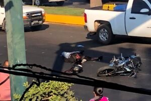 URUAPAN, Michoacán, 14 de febrero de 2026.- Un motociclista fue arrollado en la calzada Benito Juárez, frente a la central de autobuses, por una camioneta que invadió el carril contrario y que trató de darse a la fuga, pero fue detenido frente a la Universidad Don Vasco de esta ciudad.
