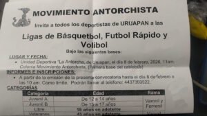 EL/ INFOMANIA/ URUAPAN, MICH./ JUE-05-FEB-2026/ El deporte es el medio para formar mexicanos de manera integral porque alienta el espíritu de lucha y superación, expresó Juan Martín Nicolás Jiménez, coordinador regional del Movimiento Antorchista en Uruapan.
