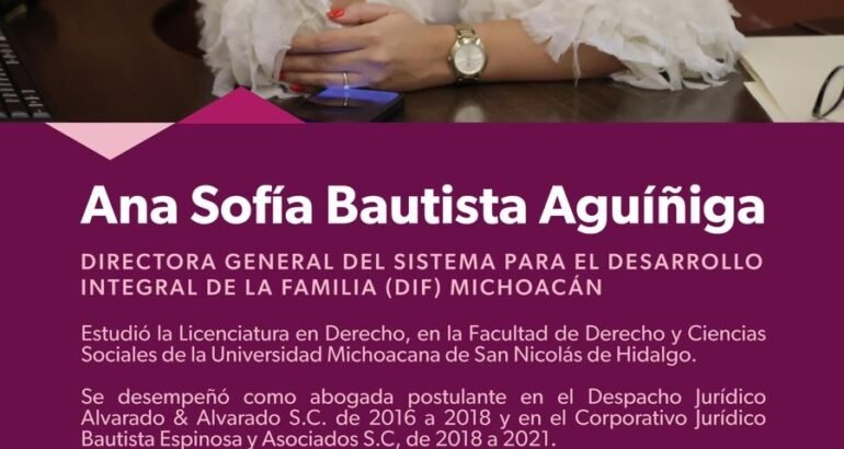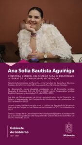 *Morelia, Michoacán, 14 de enero de 2025.-* El gobernador del estado Alfredo Ramírez Bedolla nombró a Ana Sofía Bautista Aguíñiga como directora general del Sistema para el Desarrollo Integral de la Familia (DIF) Michoacán, en sustitución de Óscar Celis Silva.