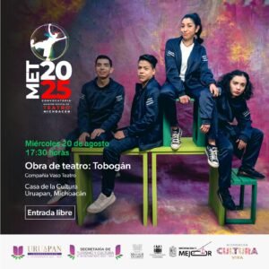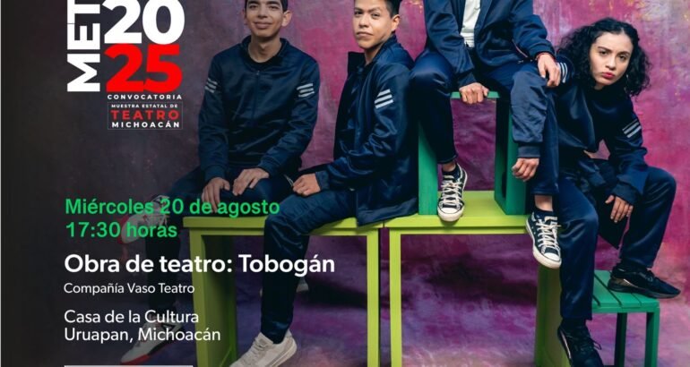En Uruapan, la compañía Vaso Teatro presentará “Tobogán” a las 17:30 horas en la Casa de la Cultura. Dirigida a público mayor de 12 años, esta comedia reflexiona con humor sobre la adolescencia, los riesgos de la sexualidad irresponsable y las violencias que enfrentan las mujeres. Vaso Teatro, compañía fundada en 2010, se caracteriza por la creación de textos originales y cuenta con un sólido recorrido en festivales como la Muestra Nacional de Teatro Colima 2019.
